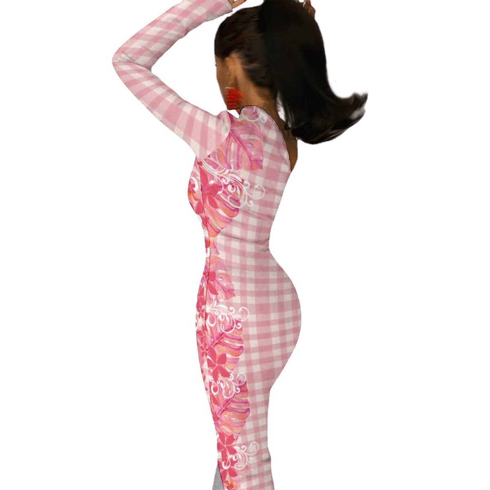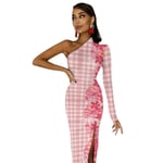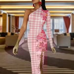 One Shoulder Slit Maxi Dress- Pink Palaka with Plumeria and Monstera Print