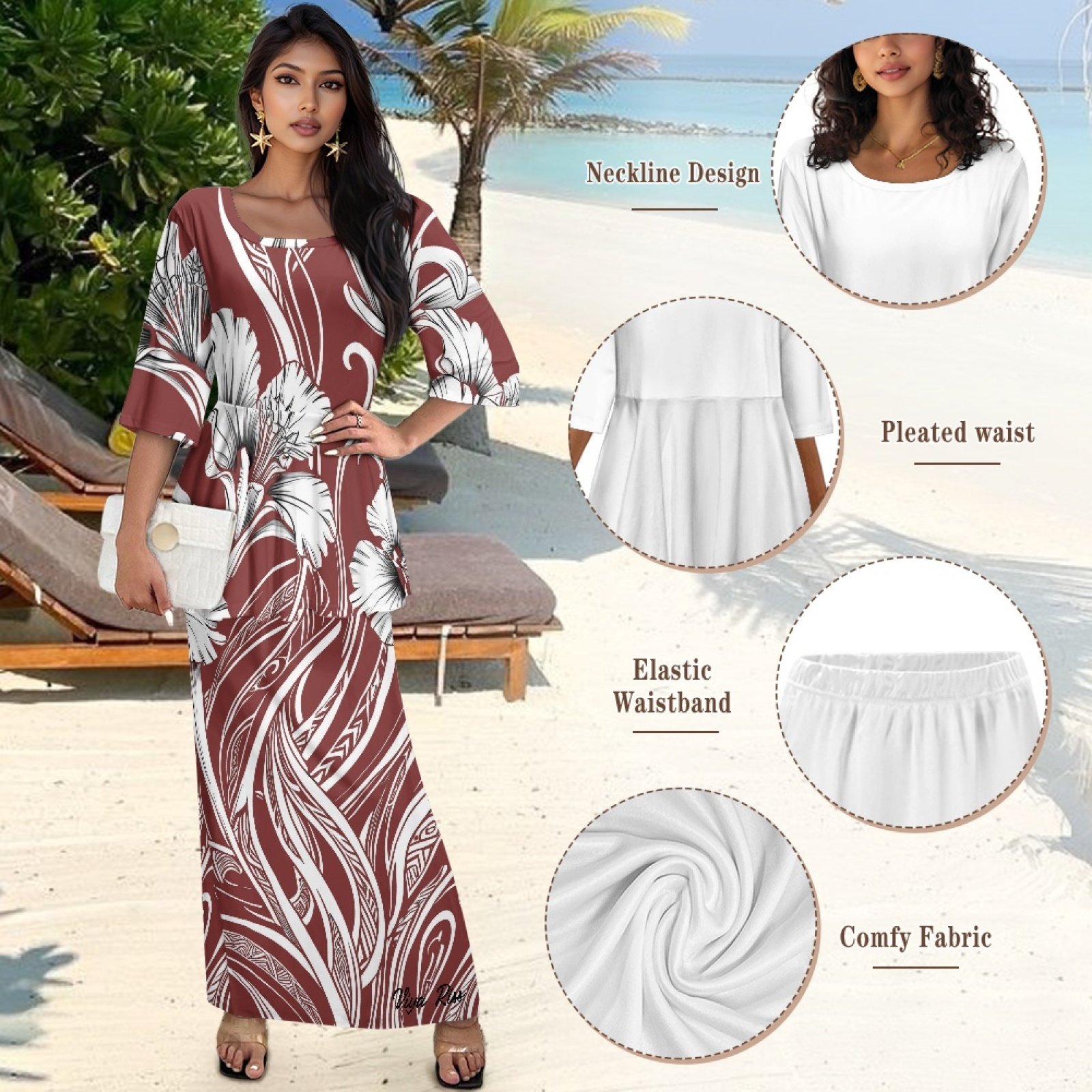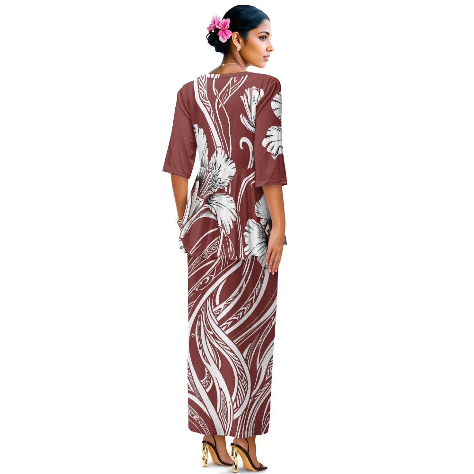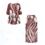 Women's 2 Piece- Round Neck Ruffled Blouse with Elastic Waist Slim Skirt- Maroon Hibiscus Tribal