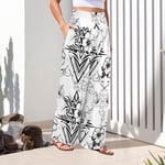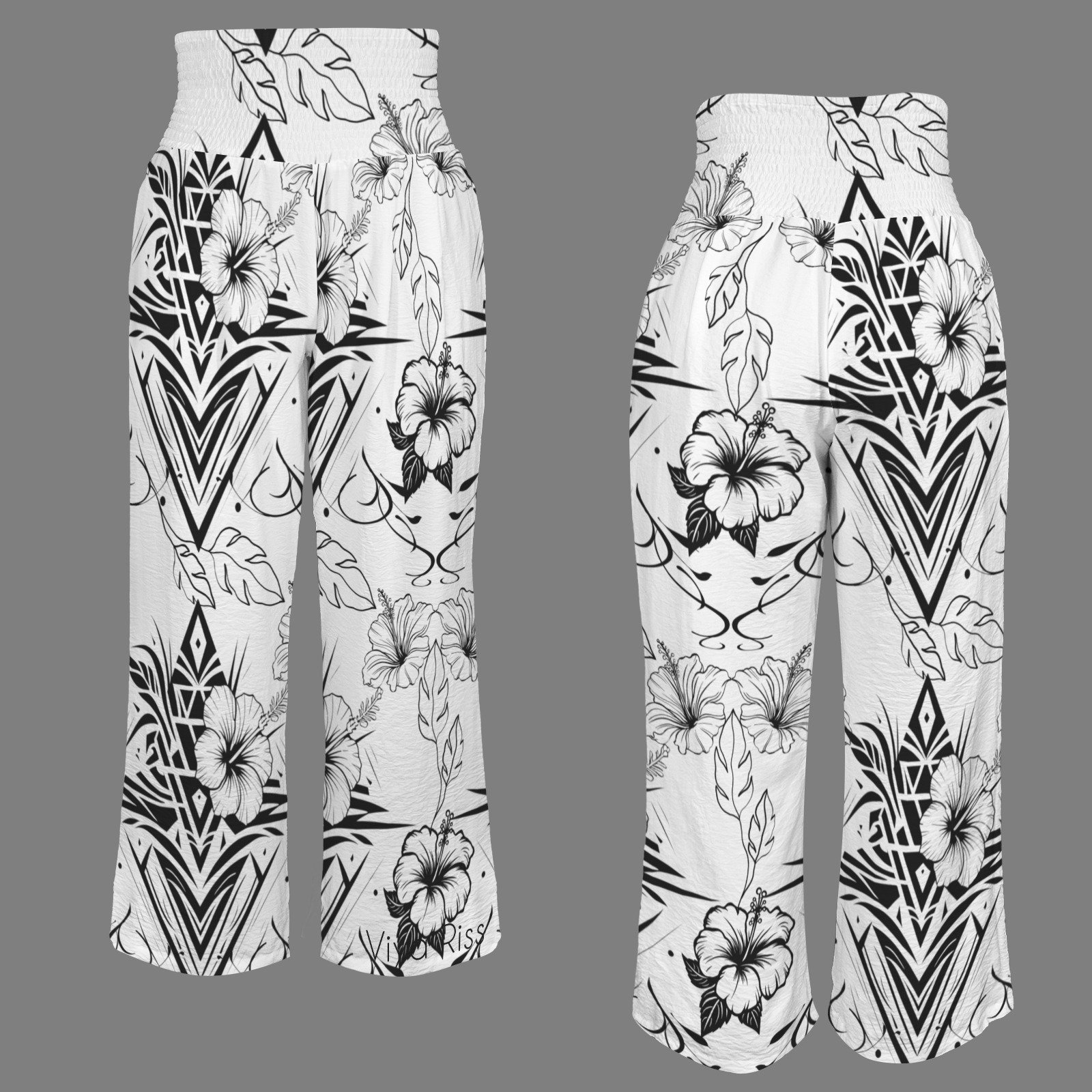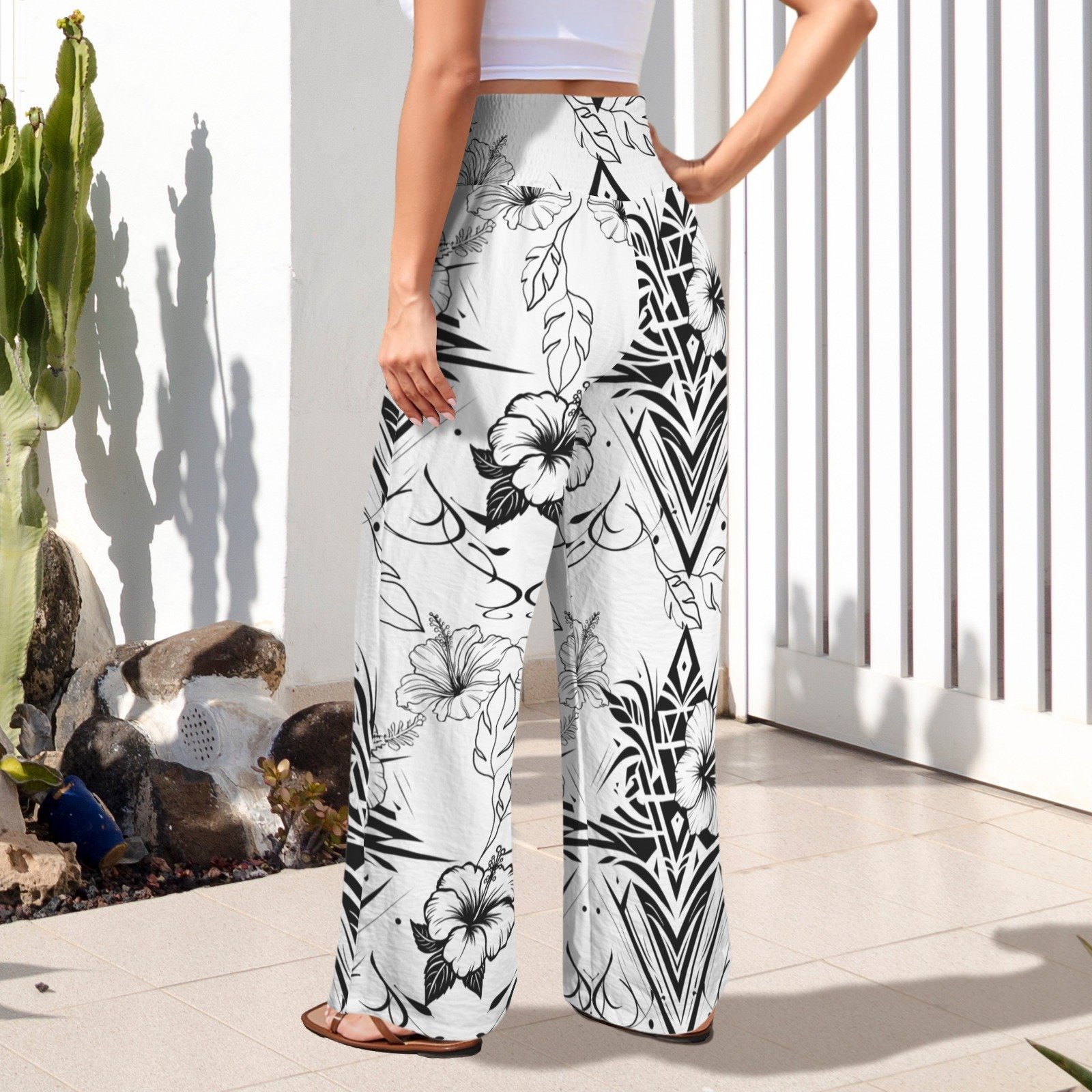 Women's Black and White Hibiscus Tribal Elastic High Waist Pocket, Wide Leg Pants