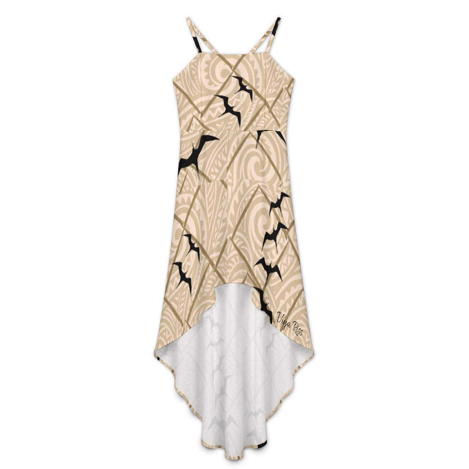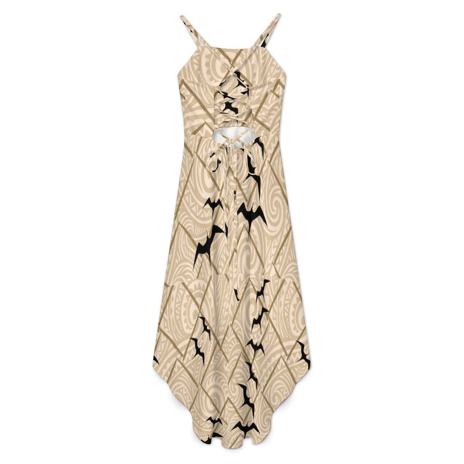 Women's Gradual Front Slant Dress- Beige Iwa Bird Print