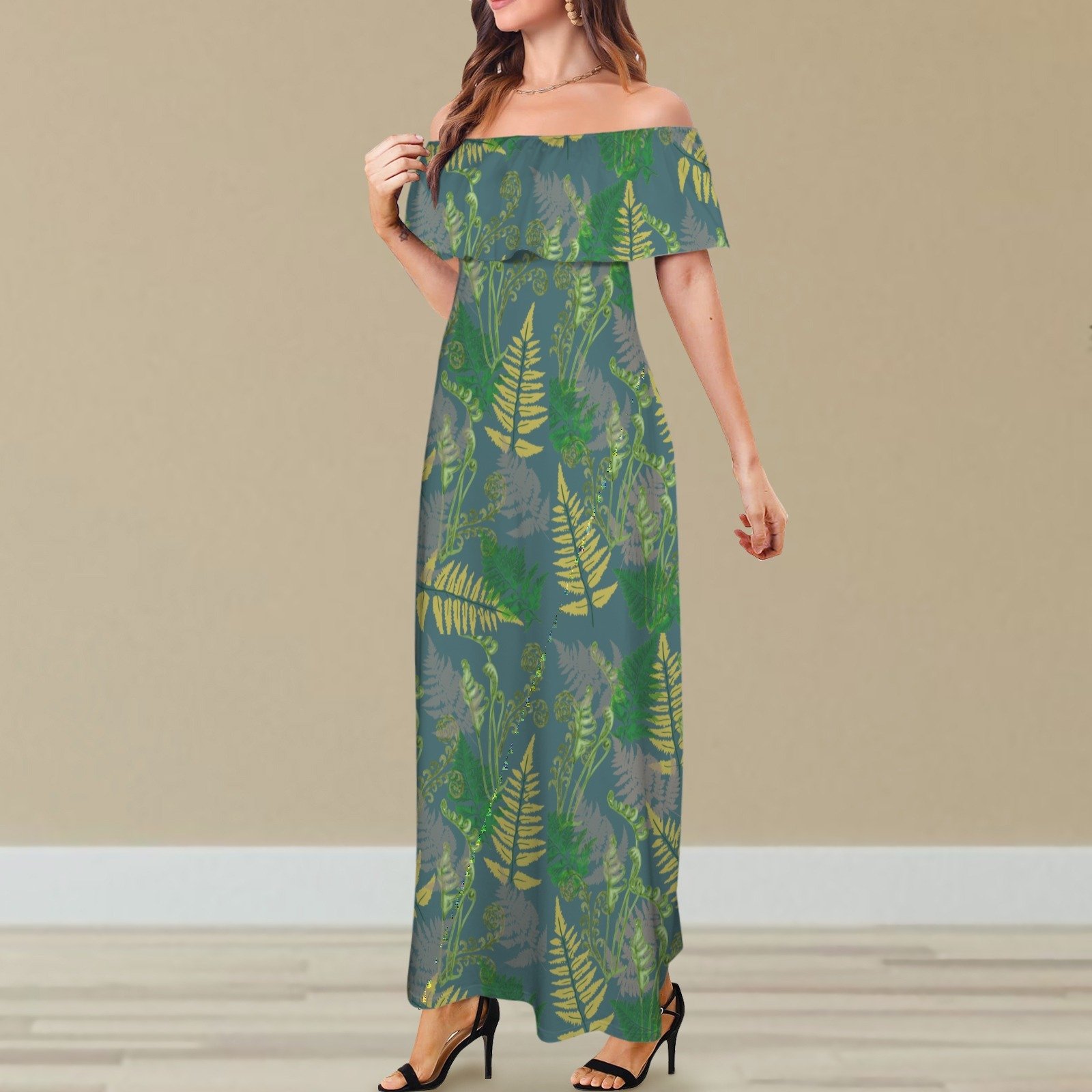 Women's Green Fern Print- Off-the-Shoulder Ruffled Maxi Dress