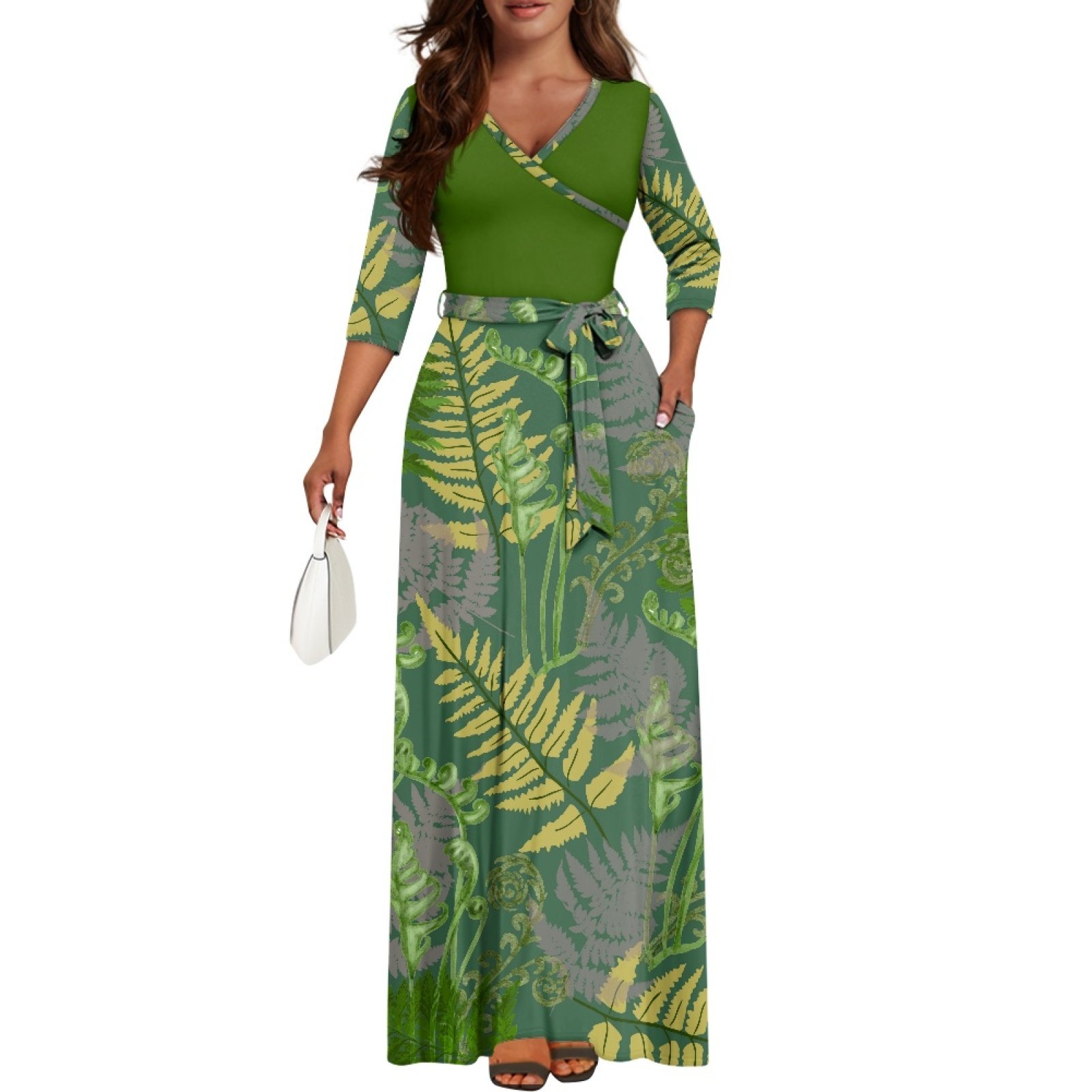 Subtle V neck tie Maxi gives you an elegant look. Made with elastic and spandex blended fabric.