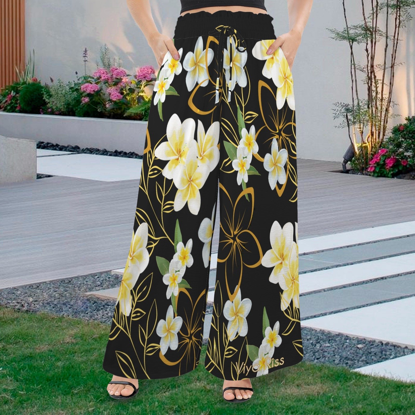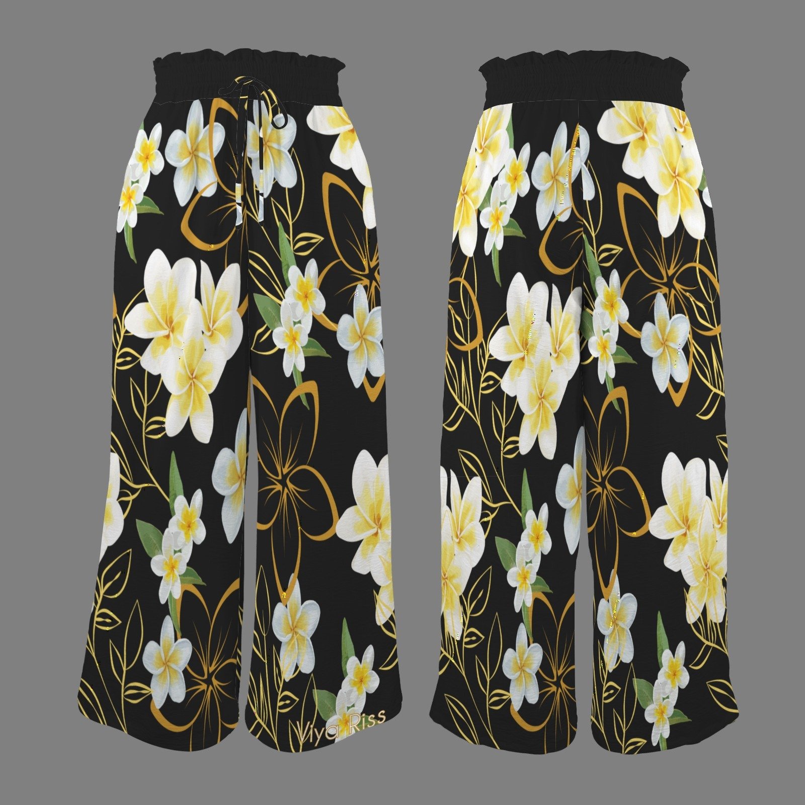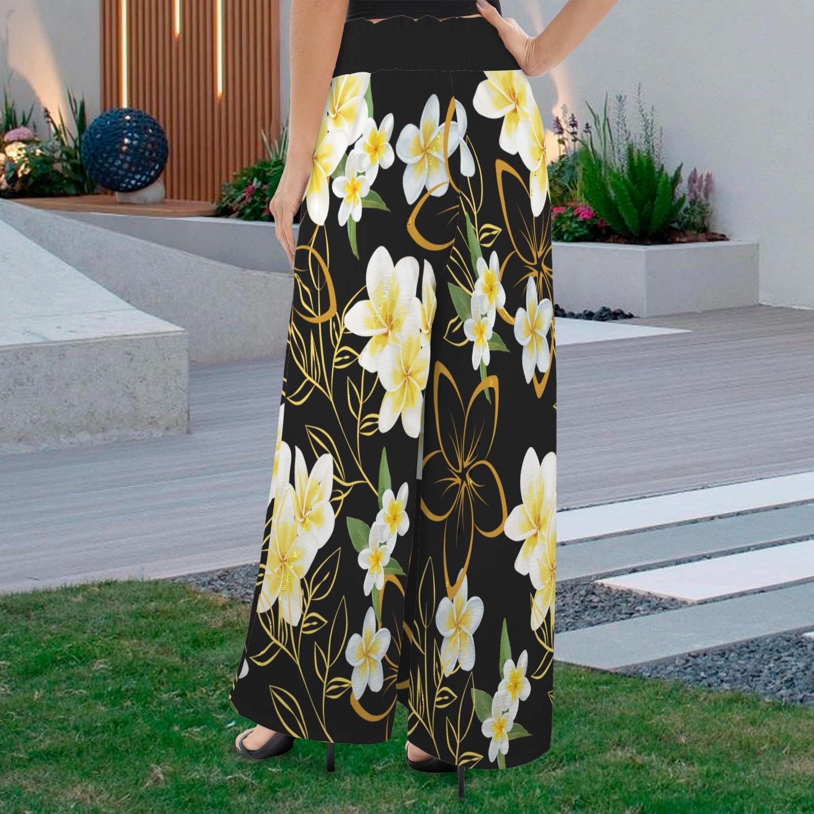 Women's Yellow Plumeria on Black Tether, Wide Leg Pants